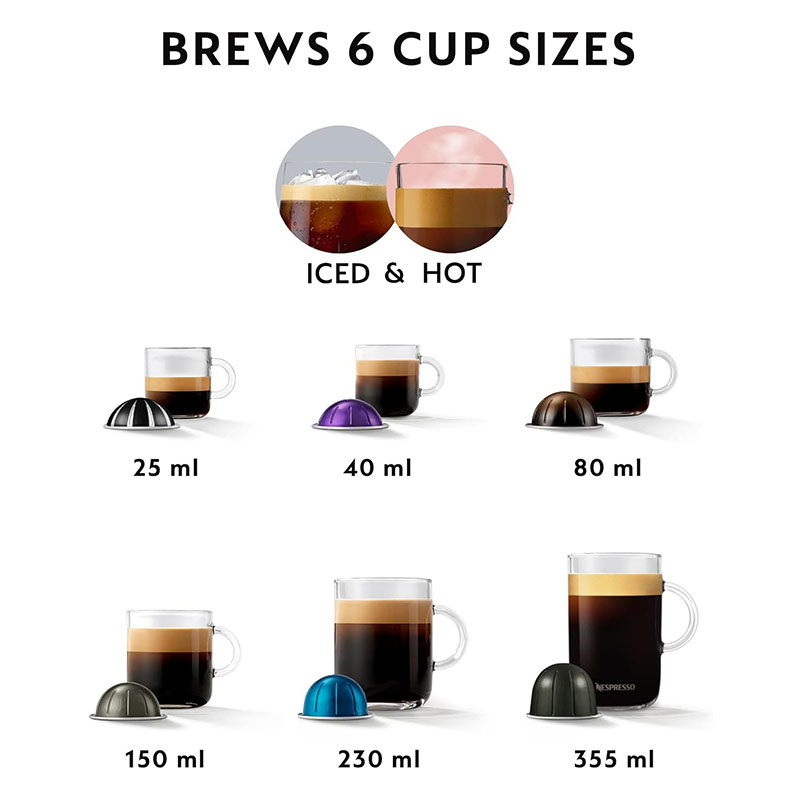 Versatile Nespresso coffee machine: 6 cup sizes (Ristretto, Espresso, Double Espresso, Gran Lungo, Mug/Coffee, XL Coffees & Cold Experiences)