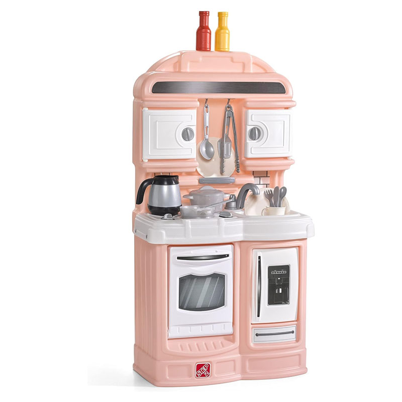 The compact design of this kitchen playset includes all of the realistic kitchen features you’d expect in a pretend play kitchen! Great for junior chefs just learning their pretend play cooking and baking skills, little ones can explore fun features like the working oven and refrigerator doors, pretend to wash the dishes in the molded-in sink with faucet, and more! Entertaining guests? Make a fresh pot of coffee with the included coffee pot. Kids can get cooking with the kitchen playset’s stovetop feature, with a fun clickable knob for added sensory play. The smaller footprint of the Quaint Kitchen is large enough for include all of the essential kitchen features, yet small enough to fit well into any home. And although this pretend play kitchen is a smaller model, it’s definitely not short on storage space!